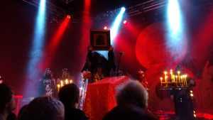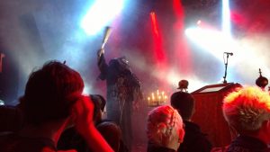 Nach ewigen 20min. Umbauzeit schaffte es die zweite Vorband namens „Schammasch“ dann auch endlich auf die Bühne. Alles Typen. Der Sänger tiefschwarz im Gesicht. Alle lange Haare, alle in lange, güldene Roben gekleidet: Ich war ein bisschen enttäuscht. Ich dachte, ich wäre auf einem schwarzen Konzert, was wollen goldene Elfen hier? Rechts und links wurden Tierschädel mit Kerzen und Weihrauch aufgestellt. Als der Sänger den Mund aufmachte, fühlte ich mich direkt wieder wohler. Wir bekamen eine musikalisch sehr schöne Offenbarung und die Stimmung wurde besser, was in diesem Sinne dunkler hieß.